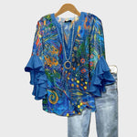 Изразете своя артистичен стил с тази блуза в интензивен син цвят, украсена с цветни абстрактни шарки и детайли, напомнящи на живописно платно. Ръкавите с волани добавят елегантност и движение, докато нежната силуета прави тази блуза идеална за ежедневни и специални поводи.