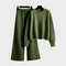 Този комплект от плетиво съчетава мекота и стил в един вид. Oversized горната част с модерен крой и широки панталони създават релаксирана, но изискана силуета, перфектна за дни, когато искаш да бъдеш удобна, без да се отказваш от елегантността.