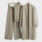 Този комплект от ребриста тъкан носи чист и модерен вид за по-хладните дни. Състои се от панталони с прав силует, безръкавна блуза с висок яка и дълго палто без копчета, предлагаща елегантност и комфорт в едно. Идеално за универсални комбинации, от домашния офис до по-неформални задължения с много чар.