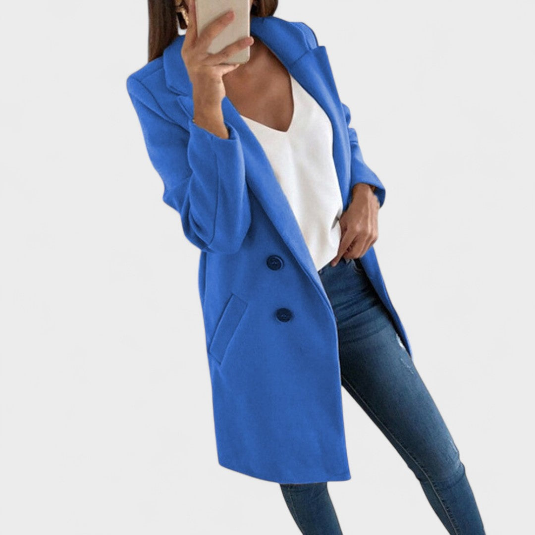 • Изгоден крой – чисти линии, ревери и дължина, която визуално удължава фигурата.