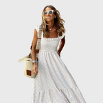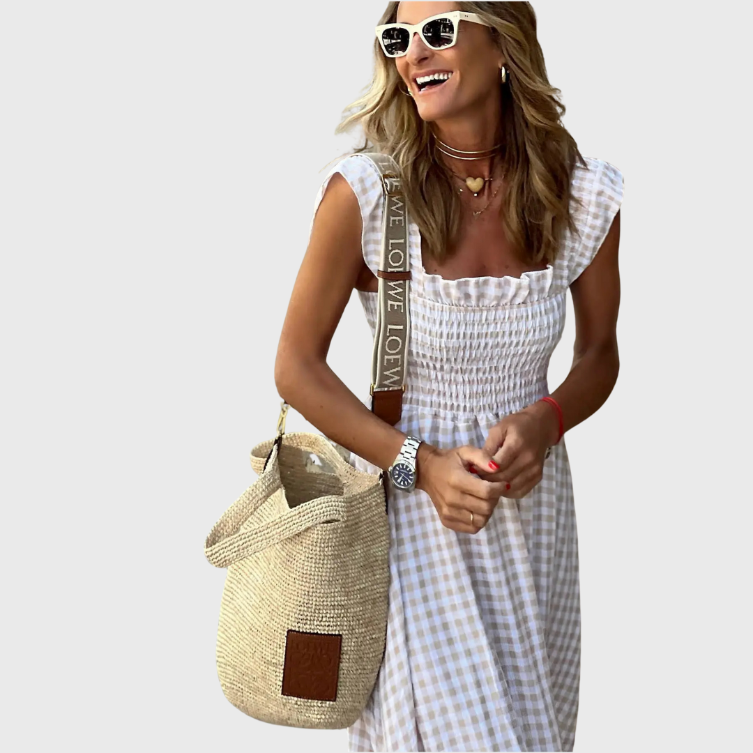 Внесете дъх на свежест и игривост в летния си гардероб с тази прекрасна макси рокля в синьо-бяло каре. Смок горната част идеално приляга и подчертава талията, докато леката и въздушна материя осигурява максимален комфорт в горещите дни. Роклята лесно се комбинира с сандали, шапка или плетена чанта за перфектен casual-chic вид.