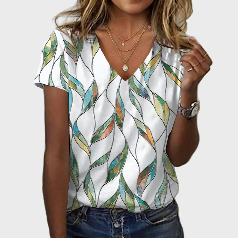 Издигнете съвременната страна на стила си с тази блуза на бял фон, украсена с цветни вълнообразни шарки в нюанси на зелено, синьо и златно. V-образното деколте добавя женственост, докато свободният крой предлага комфорт и елегантност за всяка повода.