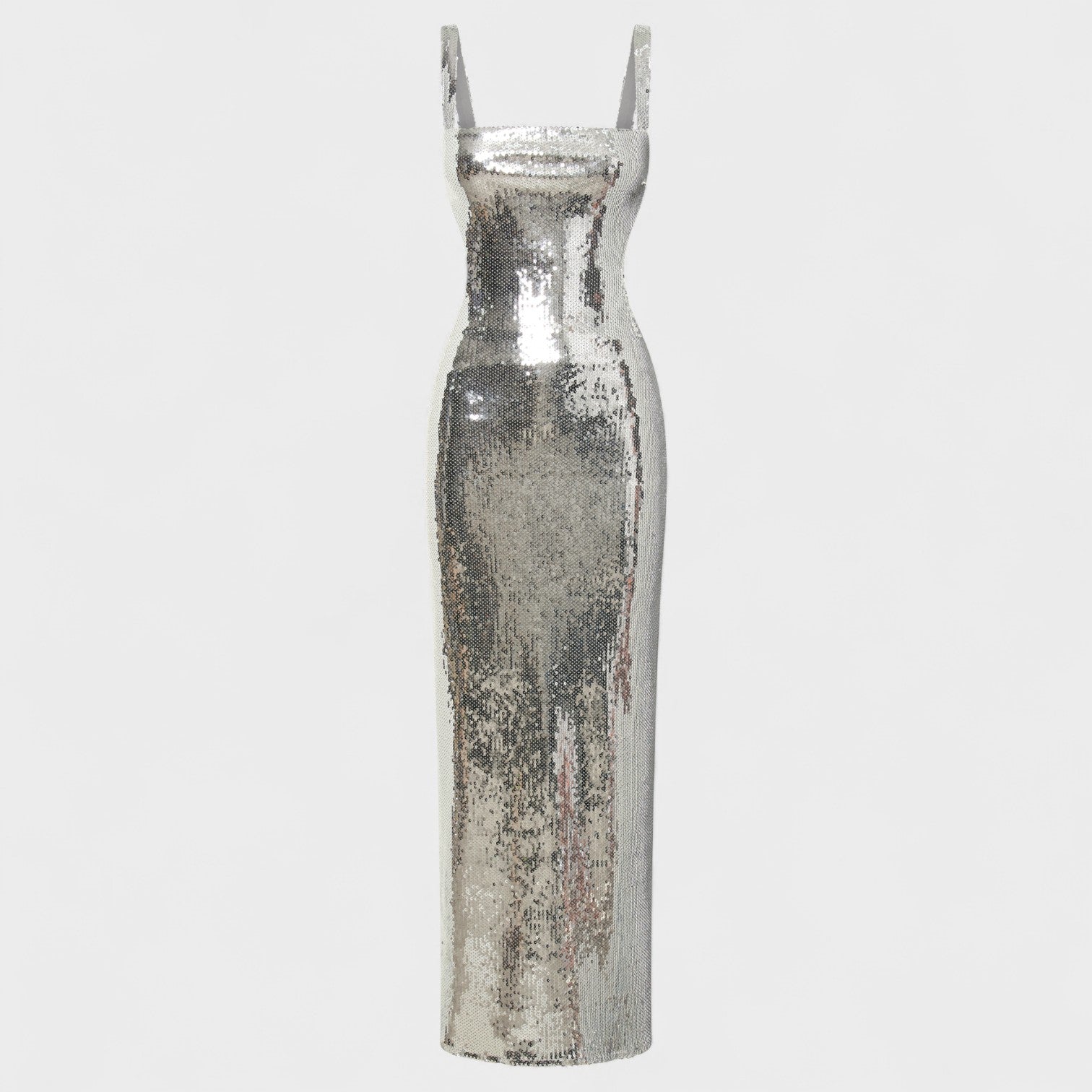 Роклята Киара привлича вниманието от първия момент. Нейната тъкан от блестящи пайети отразява светлината с елегантност, докато страничните разрези оформят силуета със sensuality. Проектирана за жени, които се осмеляват да блестят в всяка стъпка.