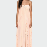 Елегантна максимална рокля с плавно движение и женствена силуета, която нежно обгръща тялото. Изразителен деколте и тънки презрамки подчертават врата и раменете, докато талията придава елегантна форма. Идеална за сватби, кръщенета и всякакви специални поводи.