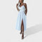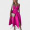 Летна Рокля Елегантност е перфектното определение за свежест със стил. С тънки презрамки, кръстосан деколте и деликатен разрез под бюста, тази рокля естествено и елегантно подчертава силуета. Флуидната пола с преден разрез добавя доза смелост, идеална за слънчеви дни, разходки край морето или открити събития. Лек, универсален и неустоимо женствен елемент.