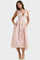 Женствена и елегантна рокля с цветен десен, която излъчва романтика. Персонализиран корсет и ефирна миди пола създават силует, който подхожда на всякаква форма на тялото. Идеална за летни излизания, сватби и специални поводи.