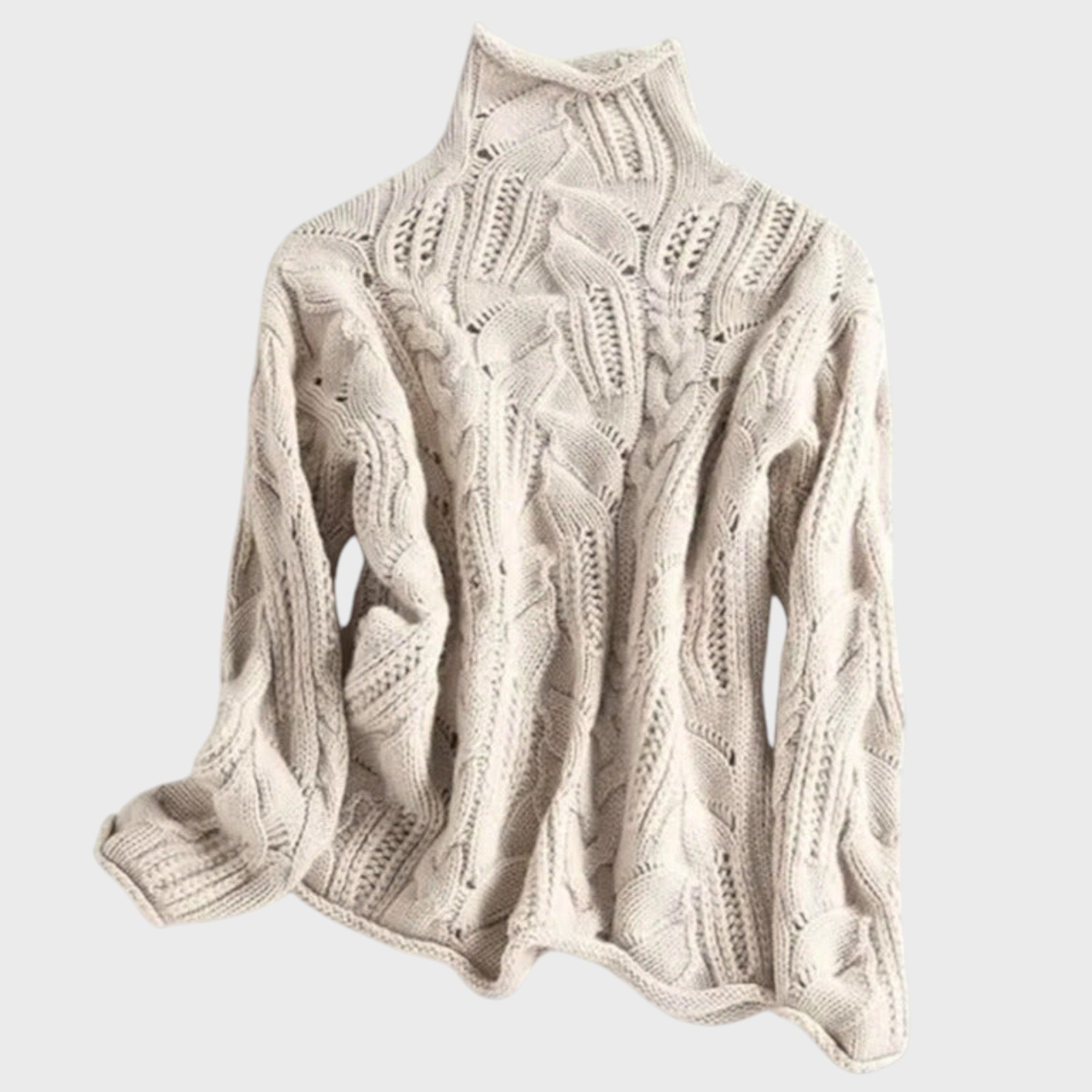 Този изключителен пуловер е ръчно изработен от най-меката прежда, съчетавайки класически стил с модерен комфорт. Неговата вълнообразна плетка и дълбоката поло яка създават усещане за уют и изтънченост, превръщайки го в задължително попълнение към вашия гардероб за студените дни.