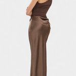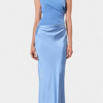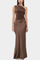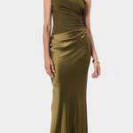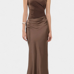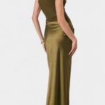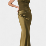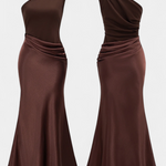 Проектирана да подчертае с вечна елегантност, тази дълга плисирана рокля комбинира сложност и присъствие във всяко движение. Нейният асиметричен изрез на едно рамо носи модерен и изтънчен акцент, докато деликатните набръчквания падат с лекота, за да оформят внушителна и женствена силует. Визия, замислена за моменти, които изискват разпознаваемост и увереност.