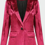 Впечатляващо сако с кадифена текстура, което придава лукс и елегантност на всяко появяване. Неговият класически яка в комбинация с едно копче на предната част създава баланс между вечен и модерен стил. Идеално за вечерни излизания или специални поводи.