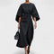 Рафинирана дълга рокля с лодка и обемисти ръкави изгражда изискана, архитектурна силует. Широкият колан подчертава талията, докато разкошната падаща пола позволява свобода на движението и грациозна походка. Минималистичните детайли и чистите линии я правят идеален избор за тържествени поводи, бизнес събития и вечерни излизания.