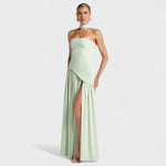 Перфектната рокля за привличане на погледите и завладяване на всяка стъпка. Нейният безрамков деколте и страничен разрез съчетават sensualност и изтънченост, идеална за събития, където тя е главната.