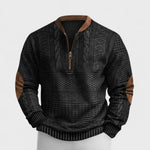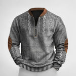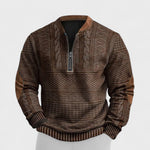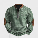 Елегантен пуловер със цип до гърди и висок, мек кант, който съчетава класическа плетка тип „кабъл“ с фина текстура за премиум усещане. Контрастни детайли от имитация на велур при яката, ципа и лакътните кръпки добавят изискан характер, а еластичните маншети и колан гарантират идеална форма през целия ден.
