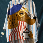Charlie | Артистична риза с куче и кафе принт е забавна, ексцентрична риза, която представя очарователно куче с барета и очила, държащо чаша кафе. Този игрив дизайн е допълнен с дръзки райета в червено и синьо, превръщайки ризата в перфектен акцент за небрежни, креативни дни. Свободната кройка и меката материя гарантират удобство без компромис със стила.