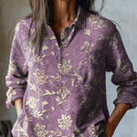 Irise | Ленена риза с флорална бродерия излъчва чар с красивата си флорална бродерия в меки златни нюанси върху наситено лилав фон. Изработена от дишащ лен, тя съчетава елегантност и комфорт, което я прави идеалният избор за всеки повод.