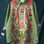 Nina | Тропическа риза с паун съчетава най-ярките нюанси на природата с артистичен дизайн. Два великолепни пауна, заобиколени от смели цветя и зеленина, превръщат тази риза във въплъщение на тропически рай. Със своя жизнерадостен мотив и нежни зелени акценти, тази риза е идеалният избор за всеки, който обича да добавя екзотичен щрих към своя стил.