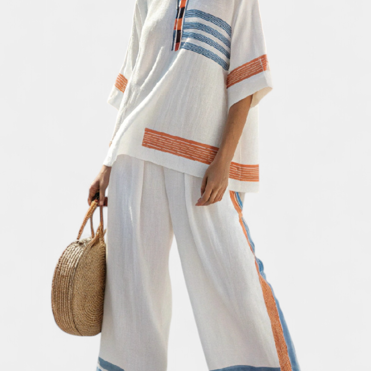 Комплект от етнически стил Daisy в бяло с детайли в синьо и оранжево – уникален и жив стил