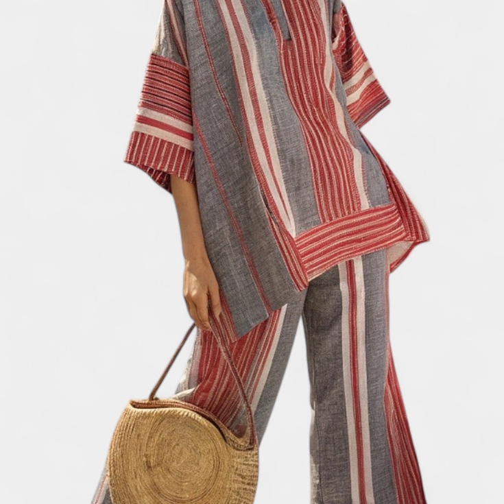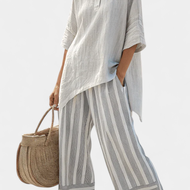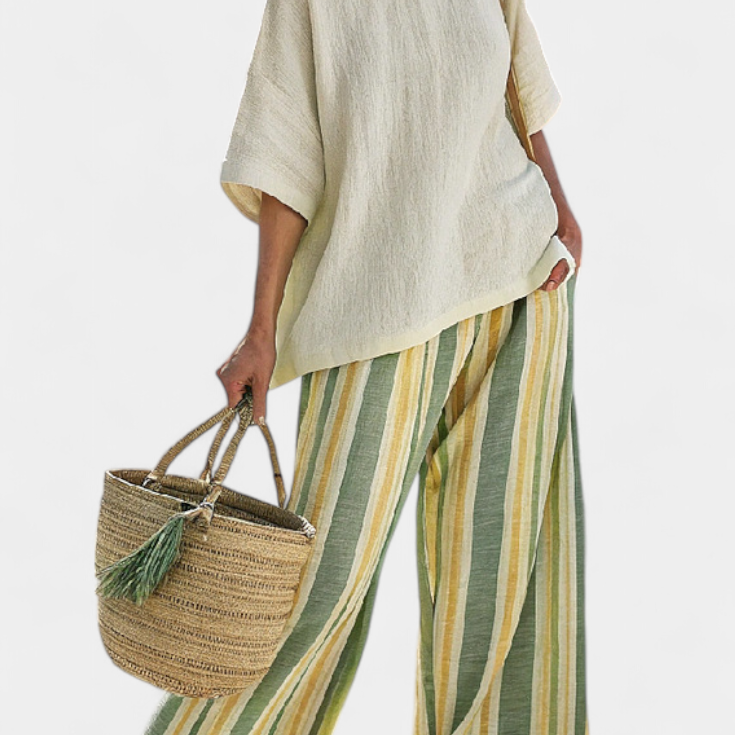 Елегантен комплект от лен и бамбук с райета и асиметрична блуза и широки панталони за изтънчен стил