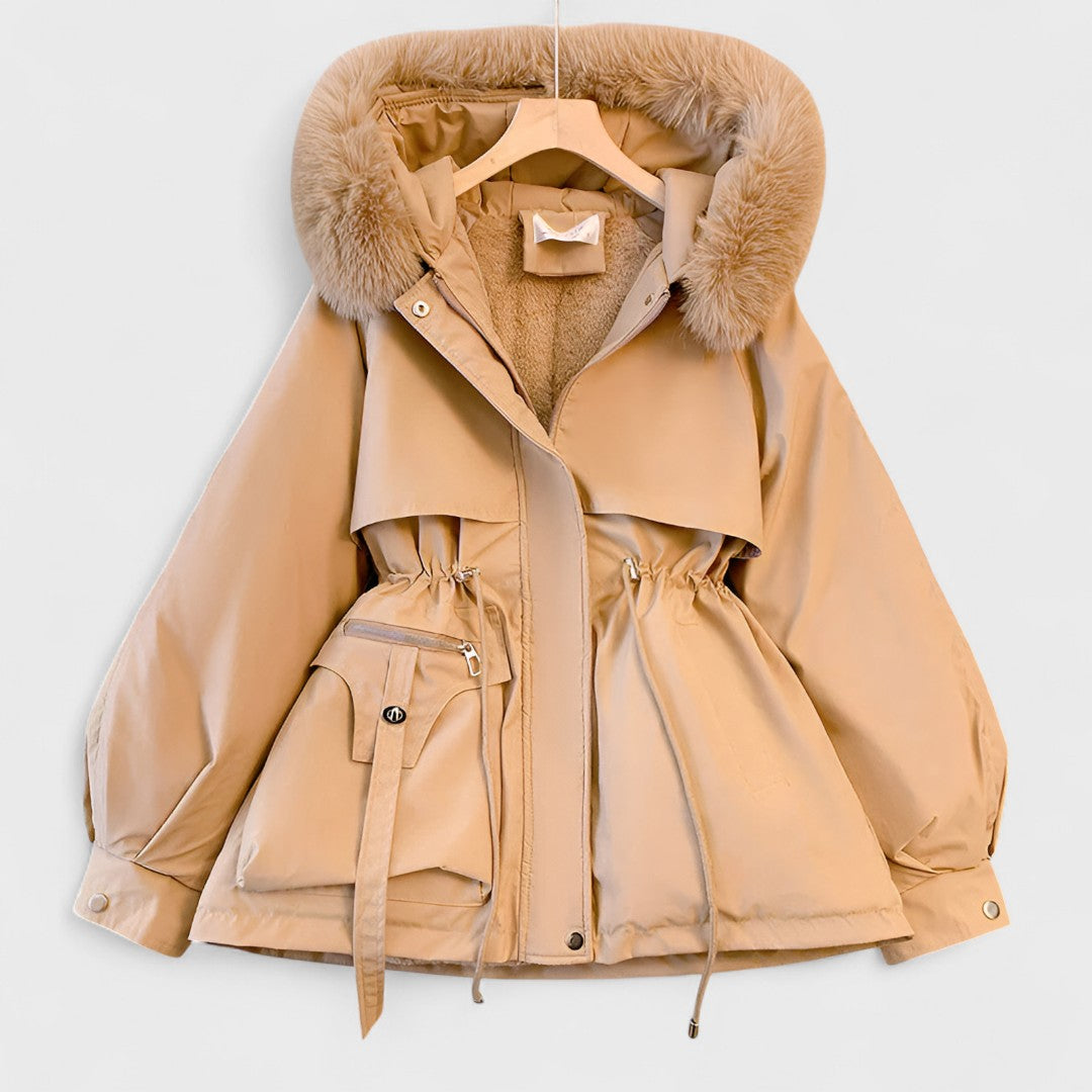• Детайли с характер – стилна качулка с пух и практични елементи, които подчертават вниманието към всяка линия.